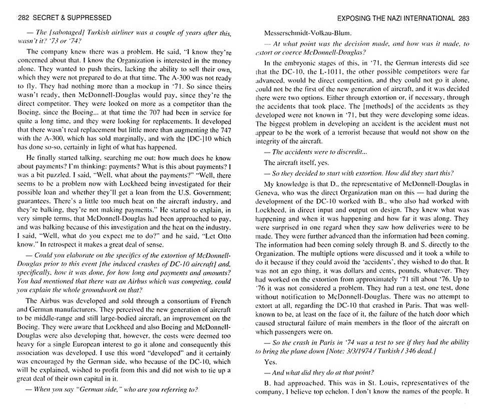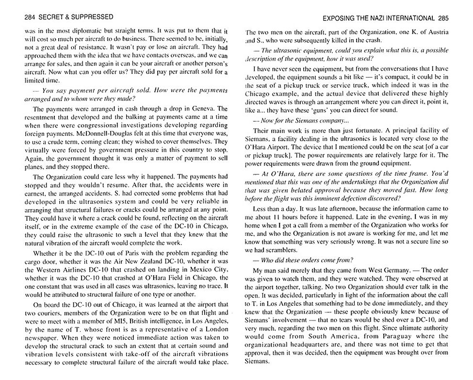 A number of DC-10s made by McDonnell-Douglas experienced "inexplicable" crashes between 1974 and 1980. Those planes came down because ultrasonic beam weapons were aimed at them (from the ground) that caused internal structural weakening that the plane's normal vibration completed and the plane went down. The first "test" crash was a Turkish DC-10 on March 3, 1974 flying out of Paris Orly Airport. The Nazi International, for which Otto Skorzeny worked, was blackmailing McDonnell-Douglas to NOT have their planes crash "accidentally" (although the blackmail wasn't stated that bluntly by the "Organization"), however, a congressional investigation of the aircraft industry around 1976 brought a halt to the payoffs and McDonnell-Douglas crashes occured periodically until the payoffs could be "re-normalized". This info was reported on pages 282 - 284 - 286 of an out-of-print book written by Jim Kieth called Secret & Suppressed. A copy of the chapter titled "Exposing The Nazi International" was sent to me by someone who wanted to help me discover more information about Otto Skorzeny. I plan to post more details in another article.