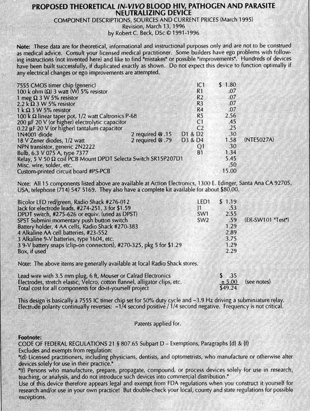 http://educate-yourself.org/be/beckelectrifierschematicandparts.shtmlIf you're accustomed to making electronic circuits, the Beck electrifier is a simple low frequency square wave design. The following circuit was offered by Bob Beck as part of his lecture package and was also published in Nexus magazine in 1998. You can read the entire Nexus article that explains blood electrification
